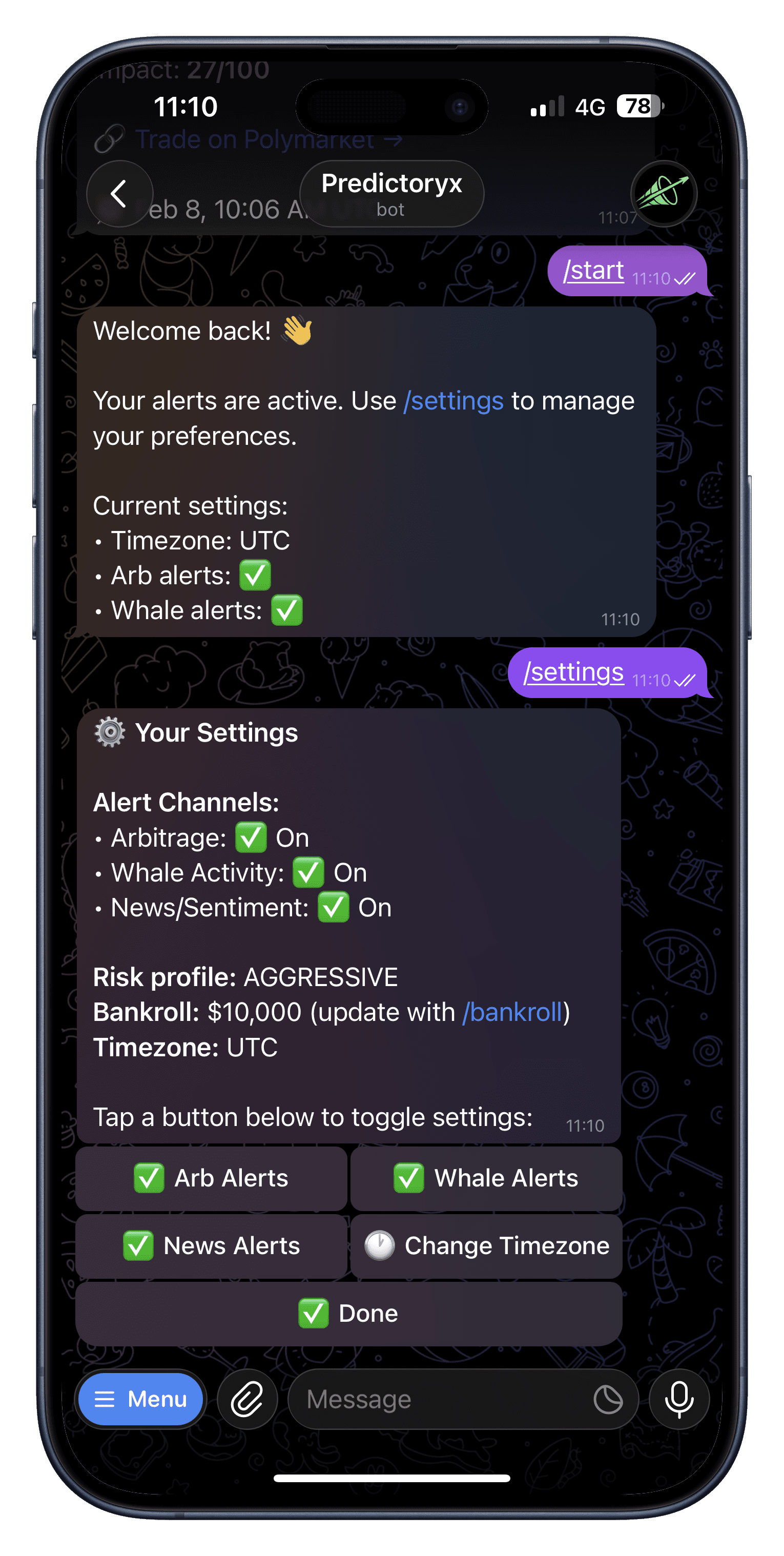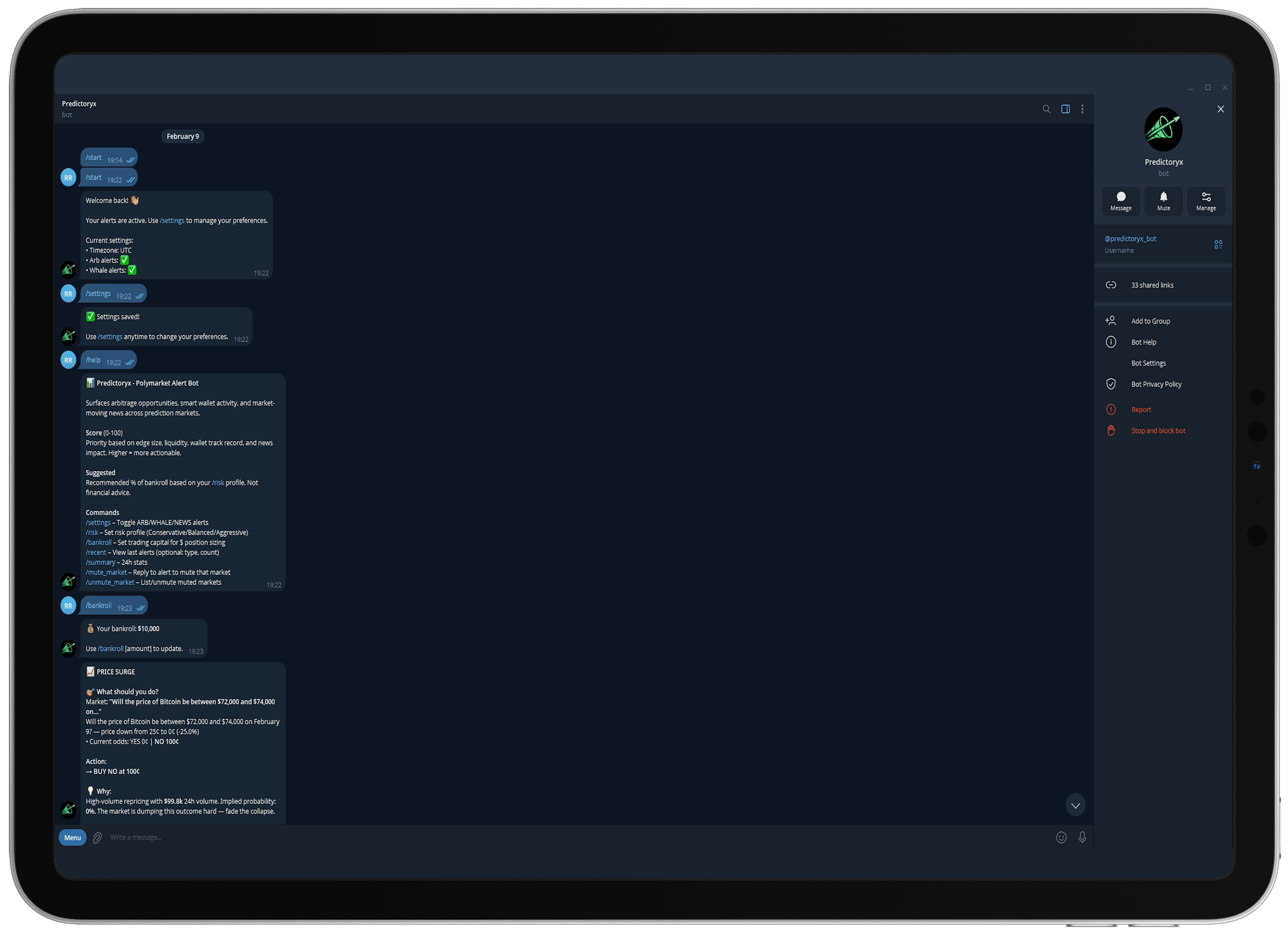 Predictoryx starts scanning Polymarket and sends you high-priority signals. You decide which to take. We handle the rest.