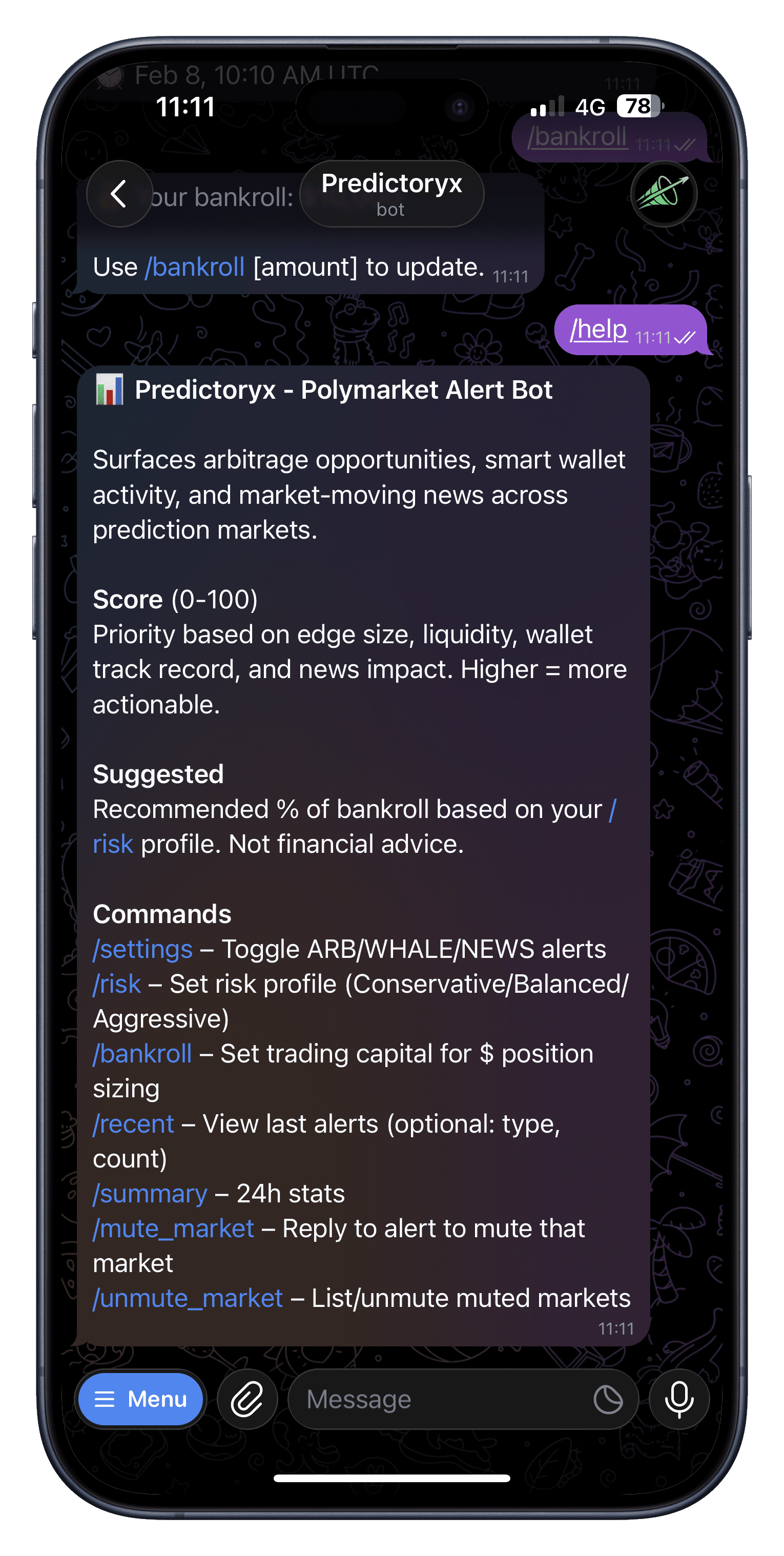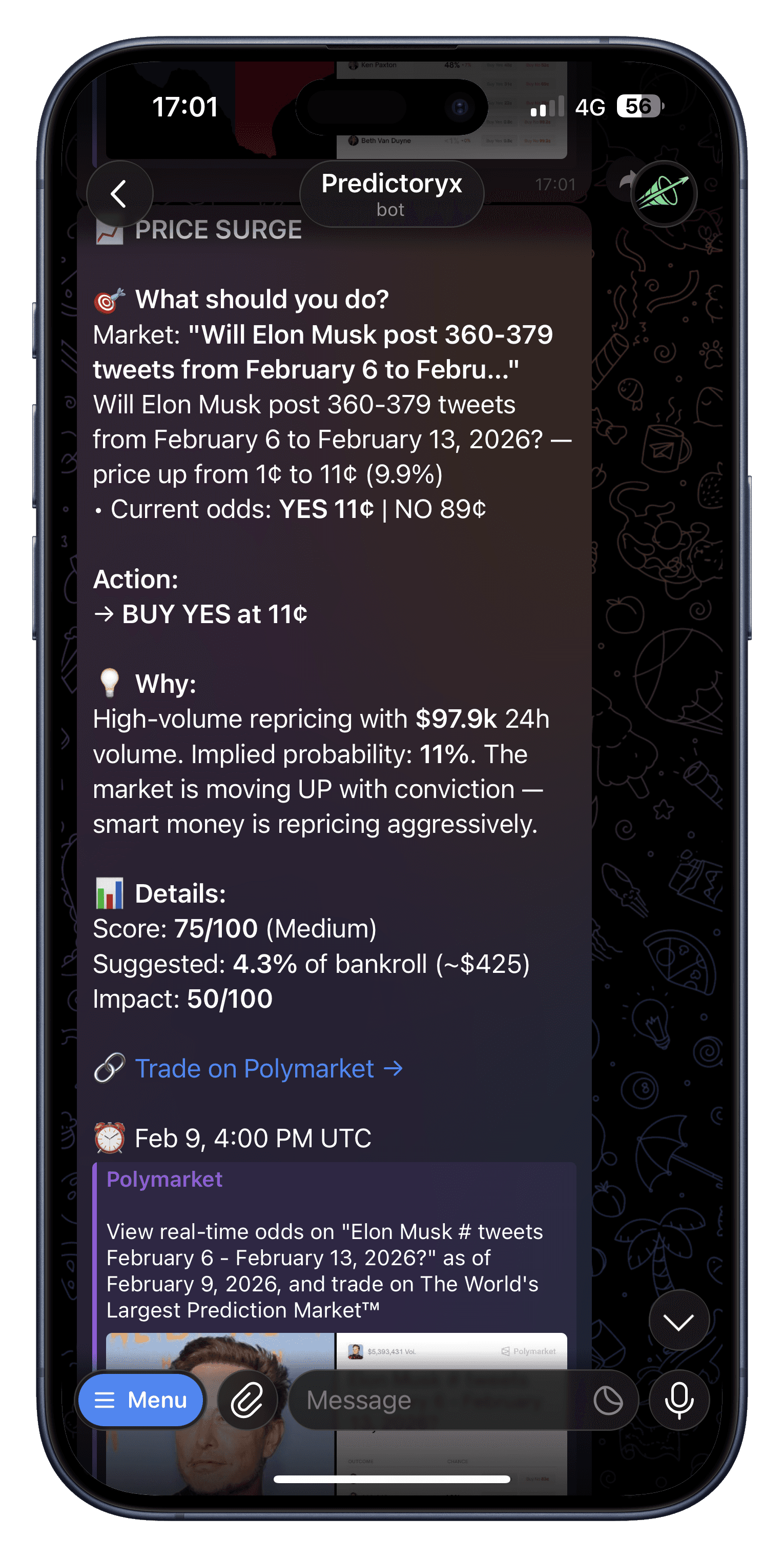 No need to monitor 10 different Discords, Twitter lists, and Polymarket tabs. Predictoryx consolidates every edge signal into your Telegramβfiltered, scored, and ready to act on.